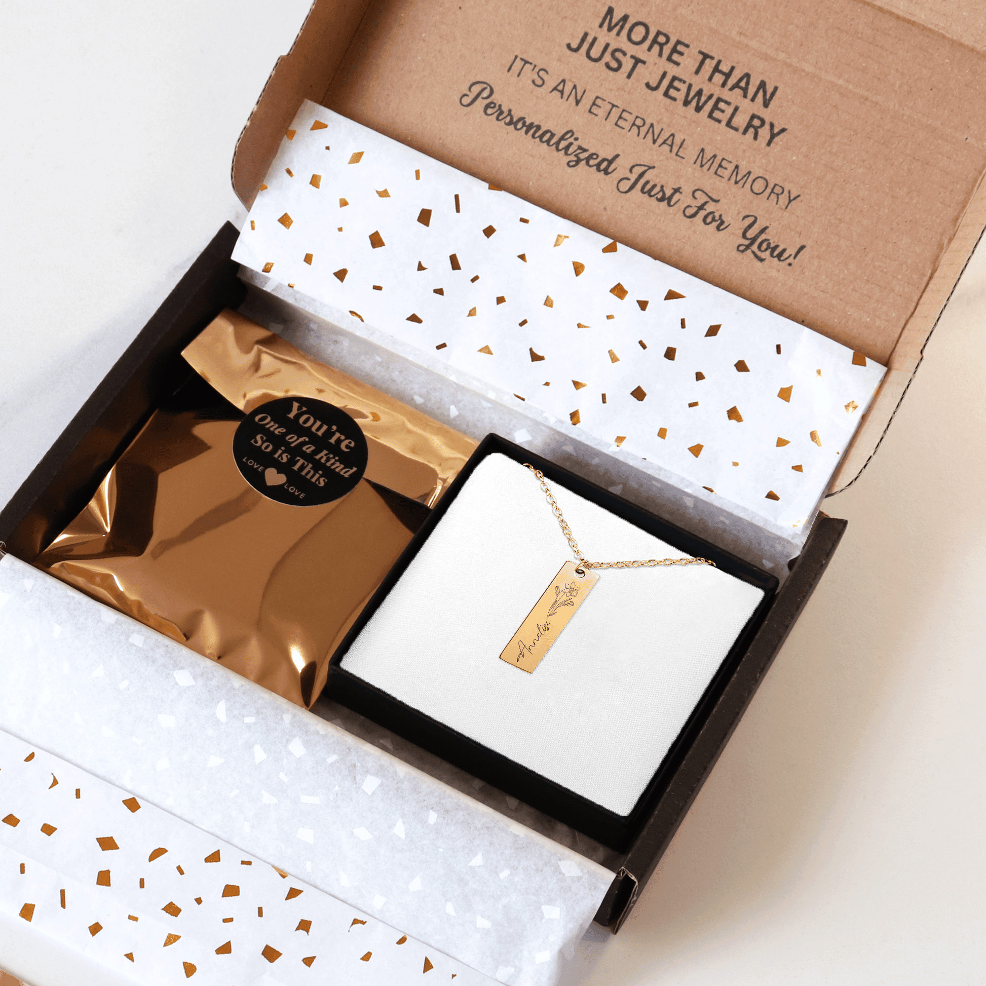 A beautifully engraved necklace, which you helped create!. The necklace will be packed in a gift box.