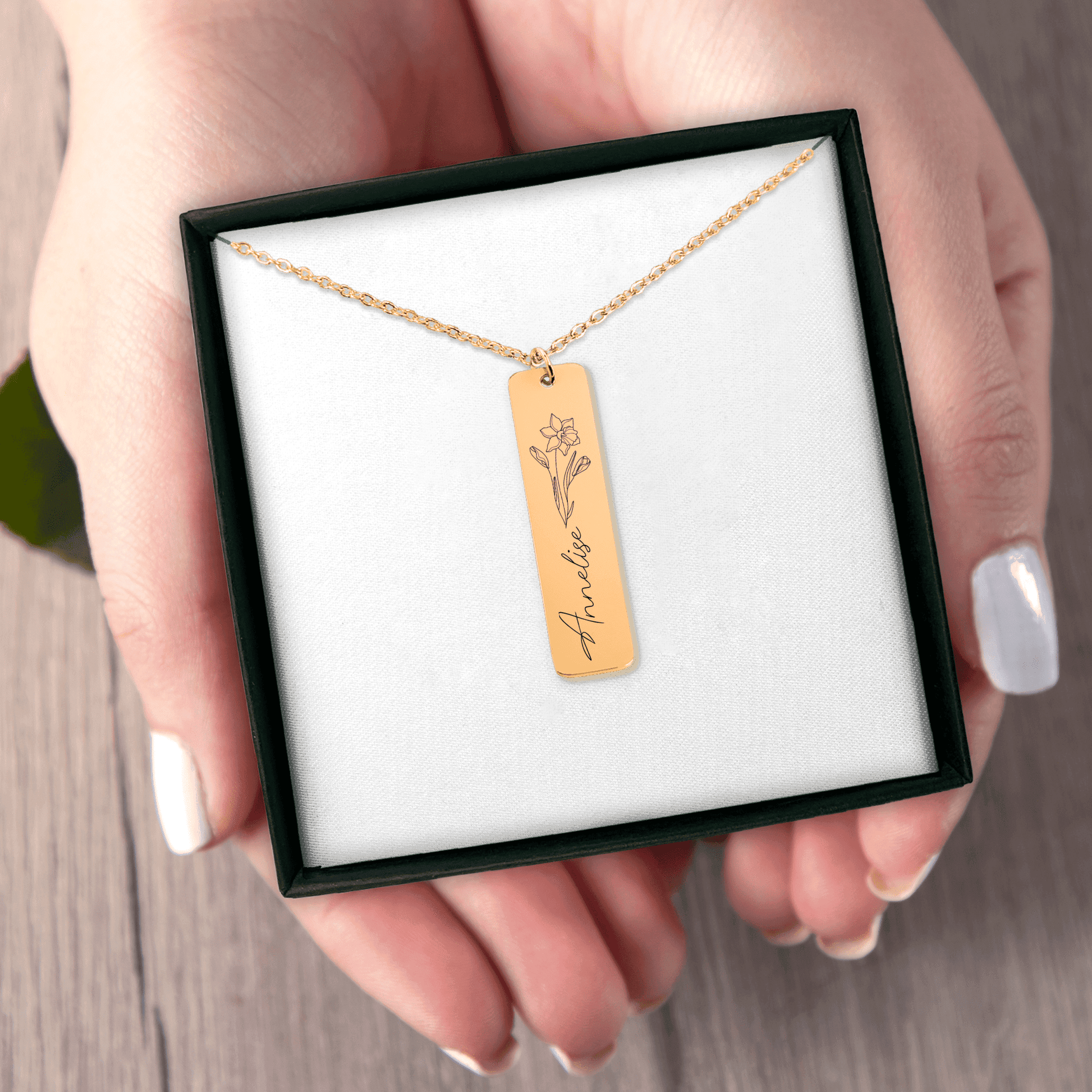 Create a truly unique gift by personalizing this necklace with a name and a birth flower. Optionally, you can choose to give the necklace an even more personal touch by adding a custom message or coordinates on the back.