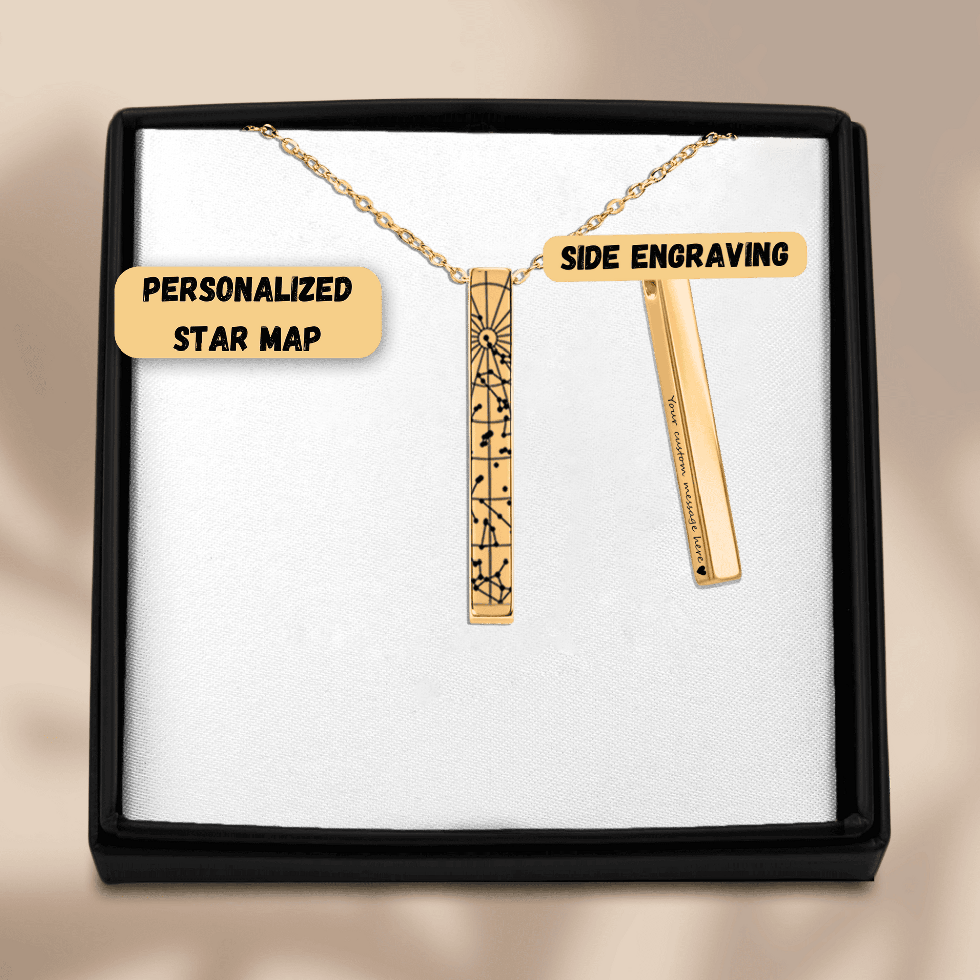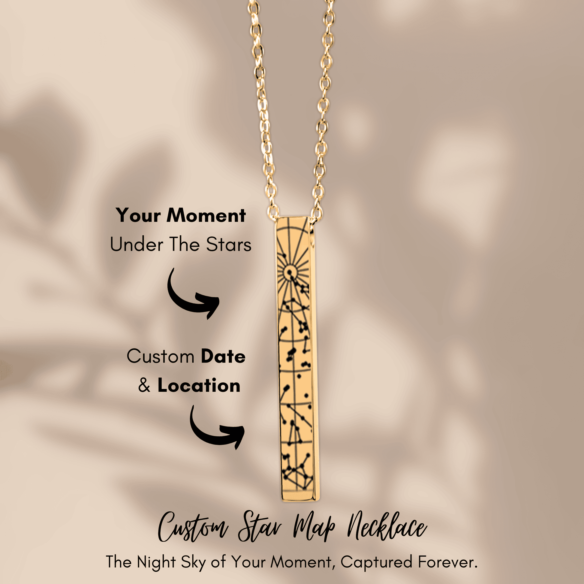 More than just a necklace… eternalize a special moment in your life with a custom star map necklace. Was it the day you met your soul-mate, the day you passed an important exam, the birth of a child, or the day you realized your world had changed? Simply add a date and a place, and our designers will customize a star map that shows exactly how the sky was looking on that specific day, from that specific place. Optionally, you can choose to give the necklace an even more personal touch by adding a custom message or coordinates on the back. This necklace also makes the perfect gift for anniversaries, birthdays, couples, and more.